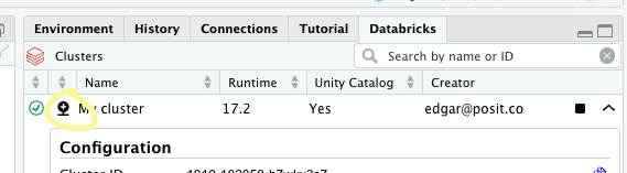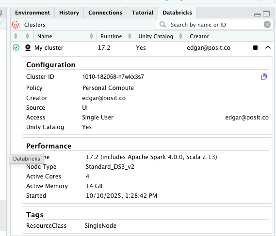 Posit Workbench provides users with a Databricks pane for direct access to available Databricks clusters. From this pane, users can view details about Databricks clusters and connect directly to them.