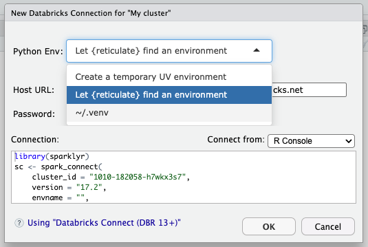 will make sure to install the correct Python packages needed to work with the cluster. But selecting let {reticulate} choose the Python environment or a .venv