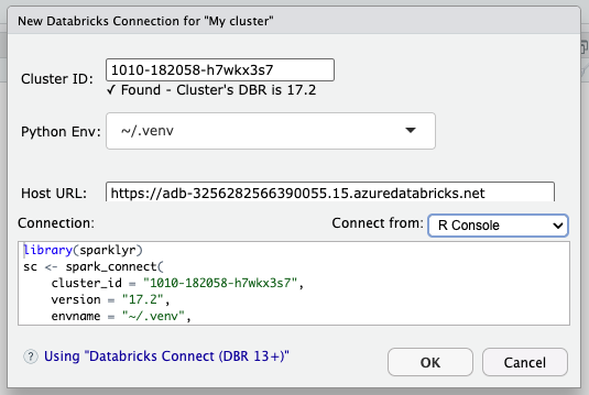 argument. We have added a way to pull the cluster’s information without starting Spark Connect. This allows us to query the cluster and get the DBR version:::install_databricks(cluster_id = "[Your cluster's ID]") pysparklyr